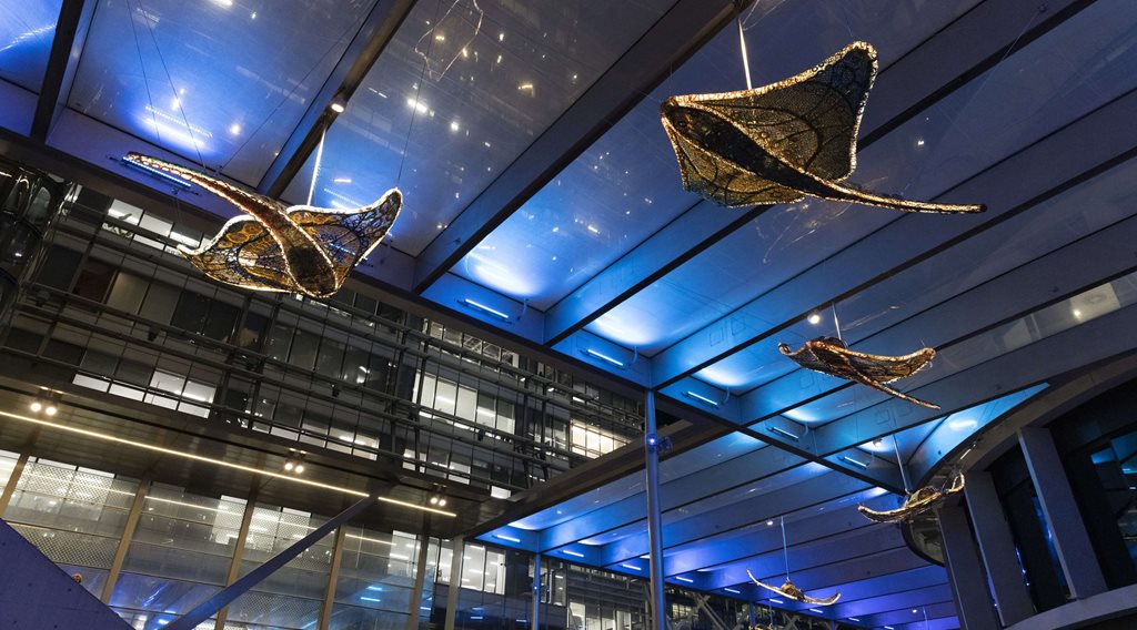 A vibrant fever of hand-stitched eagle rays can be found encircling the canopy of Exchange Square. Appearing to have arisen from the depths of Sydney Harbour, the rays are hand-stitched and woven with “ghost net” - abandoned fishing nets that have been recovered from the ocean and repurposed into a sculptural installation.
