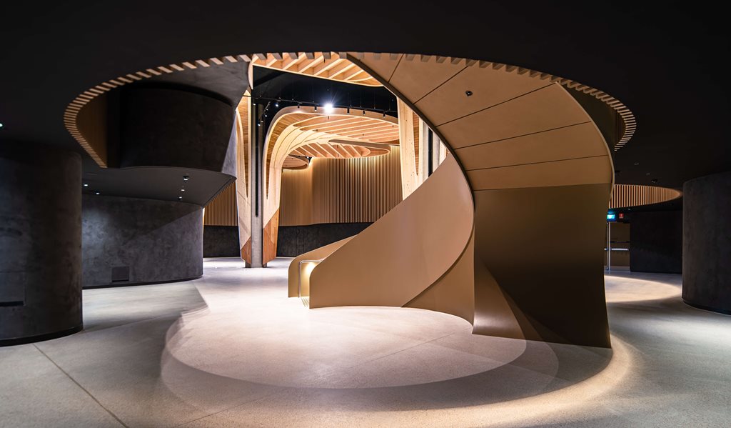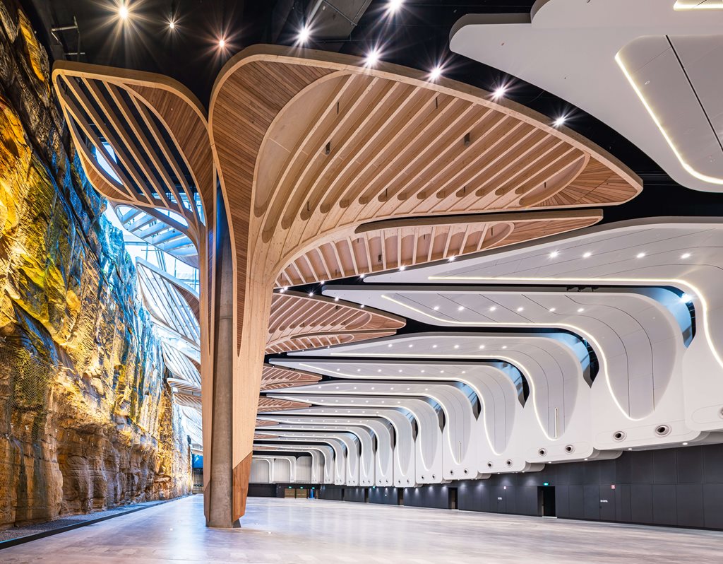 The design reveals the memories of Salt Water Country through soft, natural forms. Curved, cave-like interiors reference giba gunya (rock shelters), while sculptural timber trees evoke the space beneath the Damun (Port Jackson Fig).